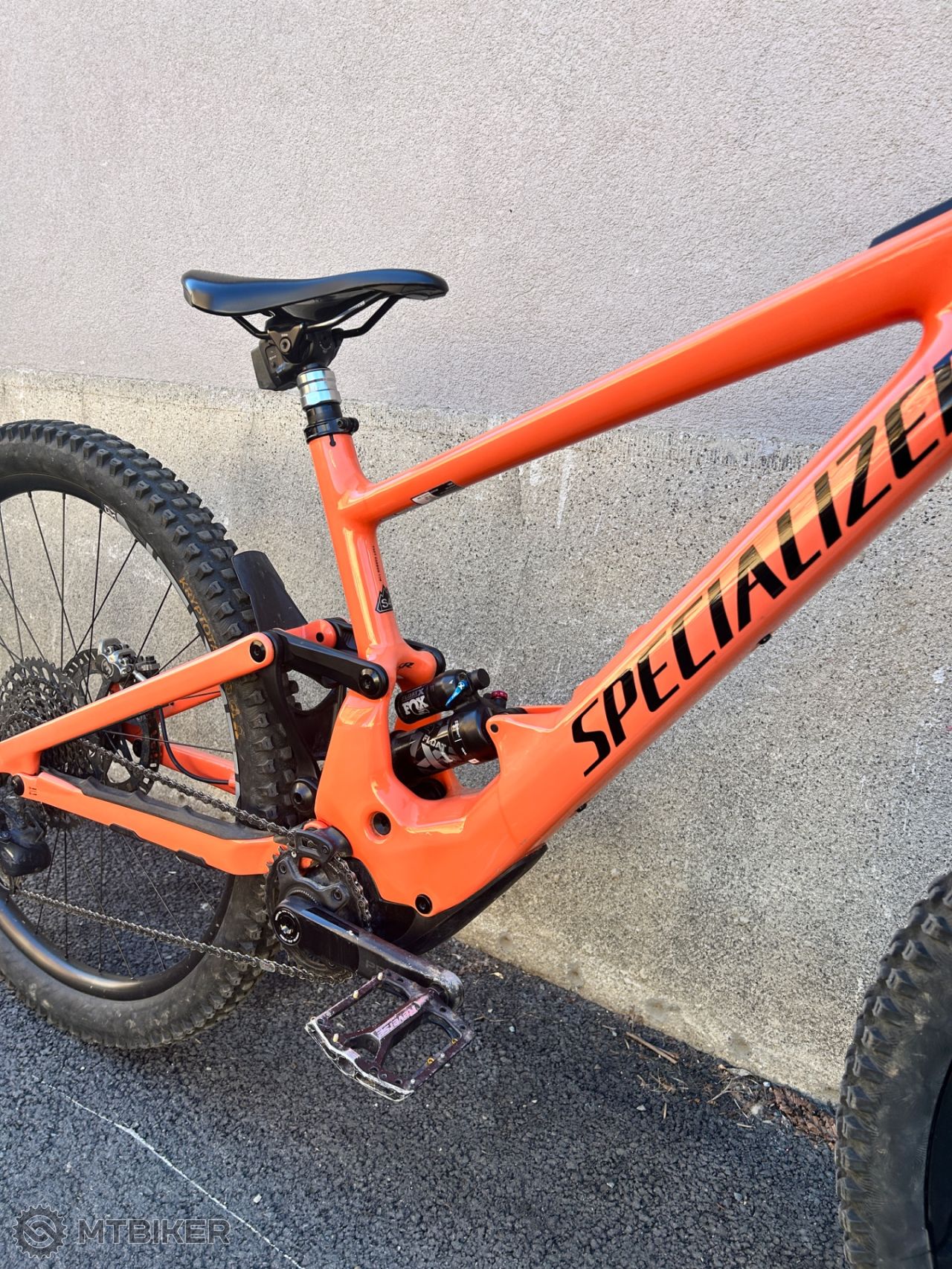 Celokarbonové e-enduro Specialized v krásnej lososovej farbe — ľahký, rýchlý, pripravený na sezónu.