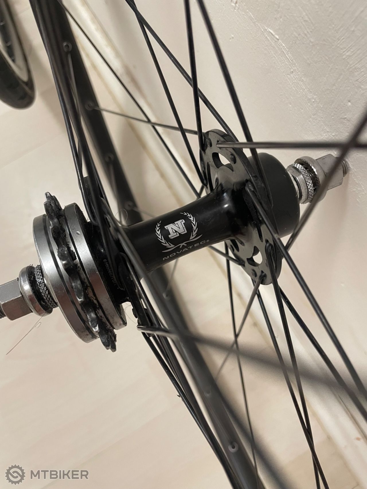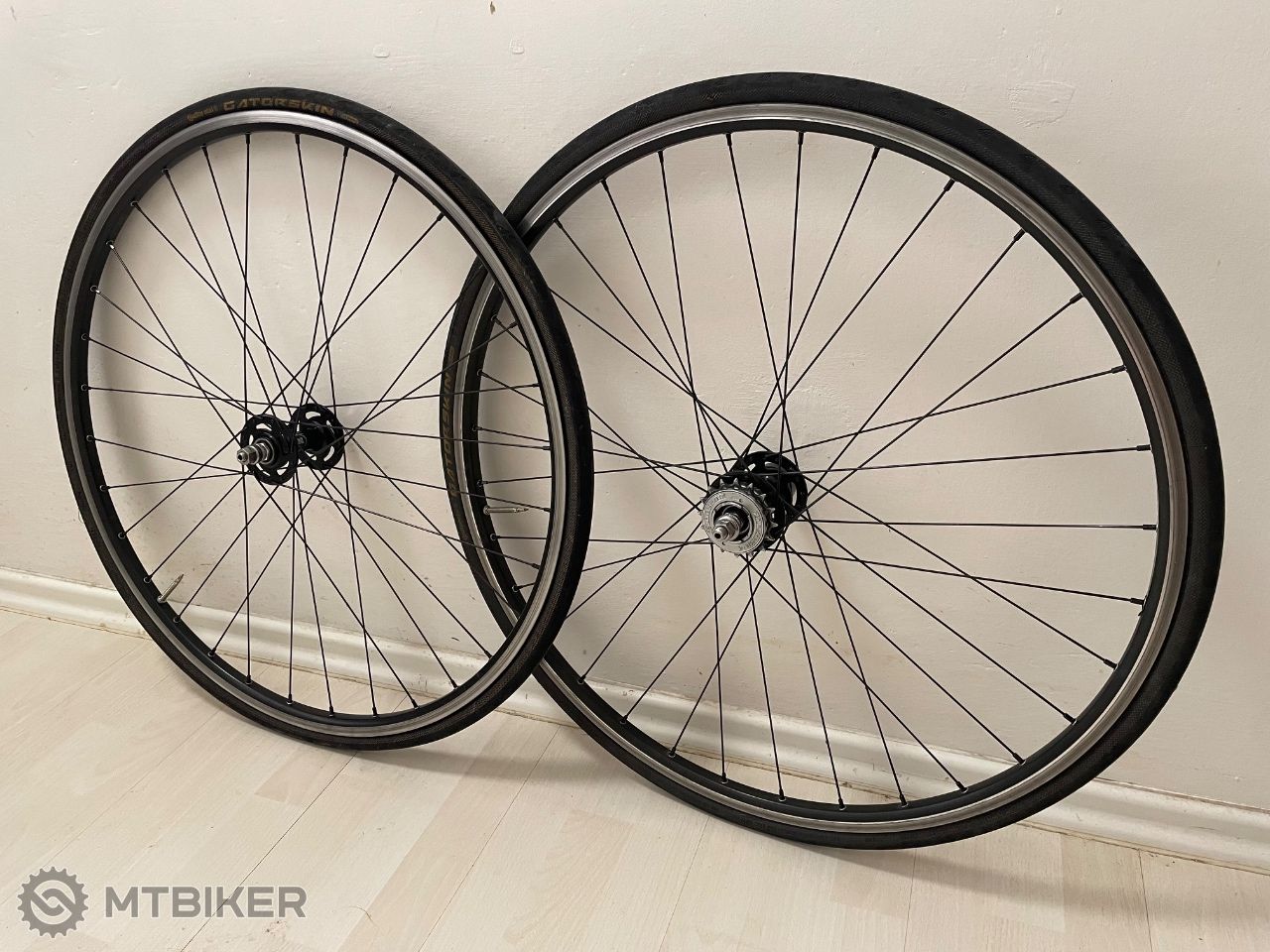 Kvalitne a rychle kolesa, naboje Novatec, rafiky dvojstenne Kellys Spark, freewheel Sturmey Archer. Uchytenie fixed kolecka zakryte krytkou. Plaste Continental Gatorskin 25c, predny este ok, zadny na vymenu aj ked ja som ho takto jazdil bez problemu. Pridam aj 2 dalsie plaste Maxxis re-fuse 25c.