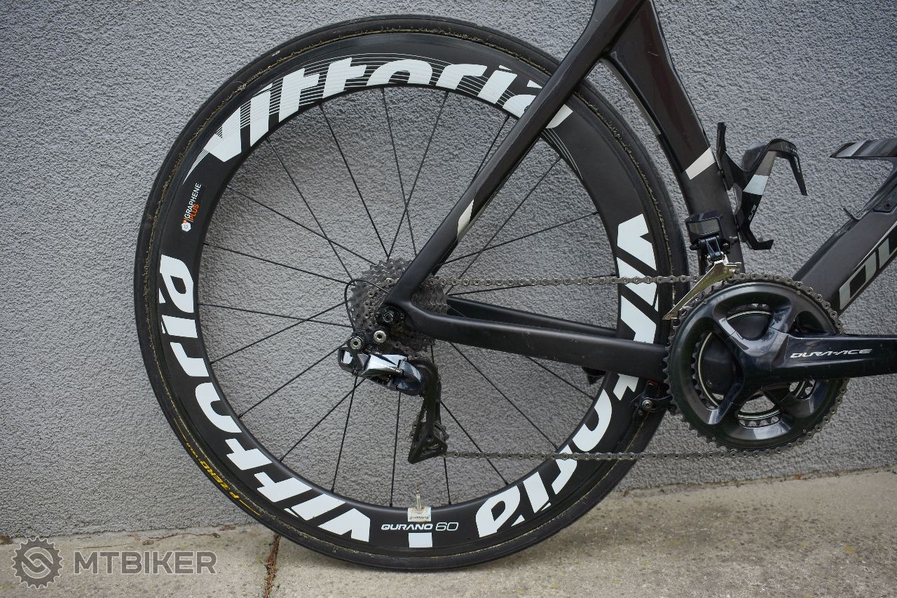 Bicykel je vybavený karbónovými galuskovými kolesami Vittoria Qurano 60 mm. Veľmi pekný na pohľad a skutočne aero.