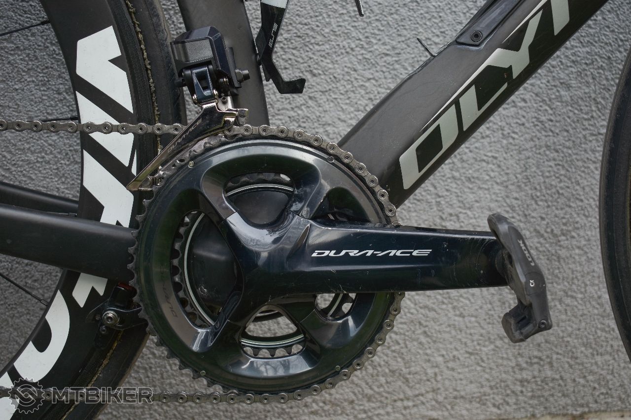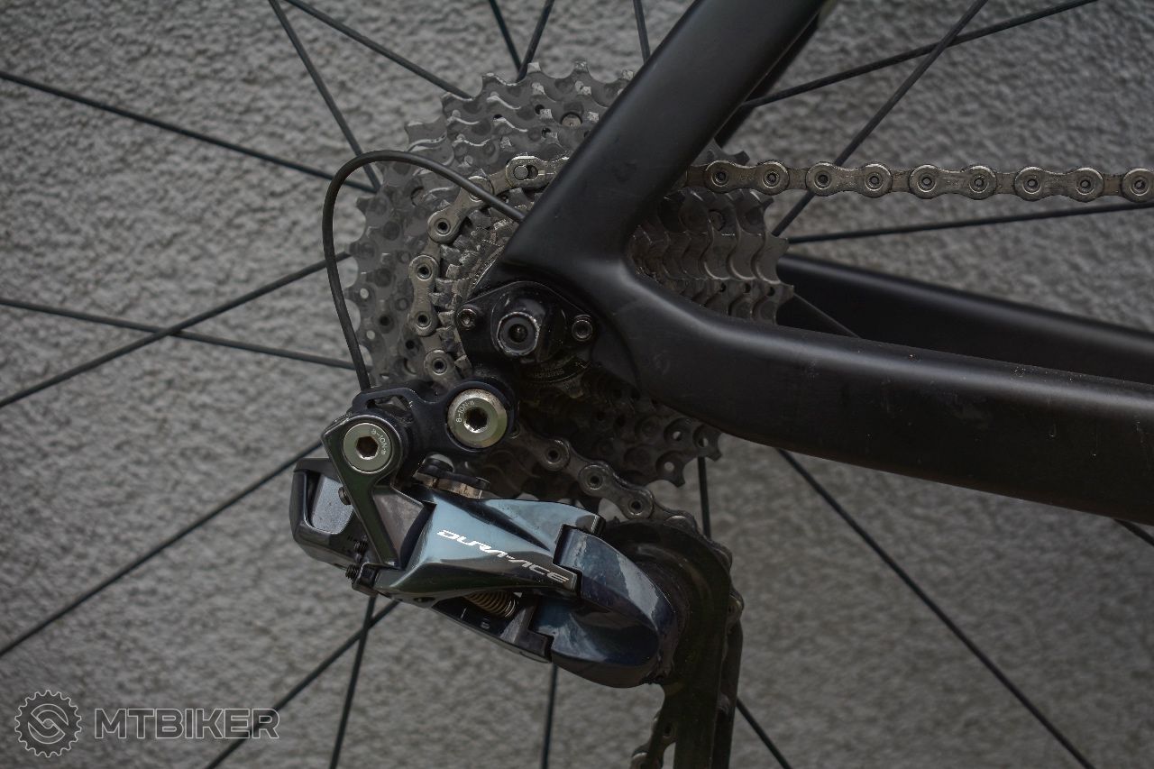 Osadený kompletnou sadou Shimano Dura-Ace 9170 Di2 s klasickými čeľusťovými brzdami. Radenie funguje bezchybne.